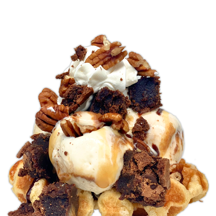 This three scoop sundae is served on top of a warm Sugar Pearl Waffle. It begins with Sea Salt Caramel Ice Cream, topped with brownie pieces and pecan pieces, then finished with hot fudge, caramel sauce and whipped icing.