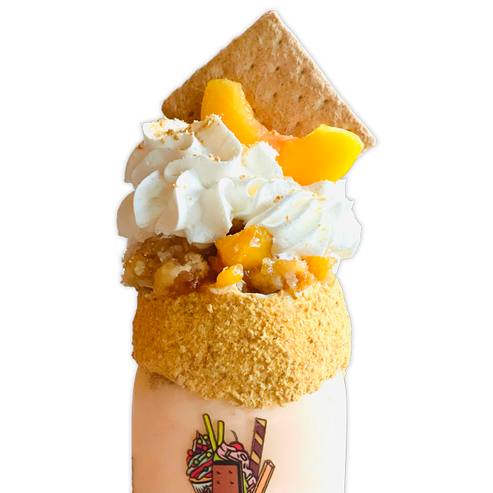 On this month's slate of featured shakes are a peachy keen take on everyone's favorite southern summer dessert, Peach Cobbler, a classic Root Beer float with a twist and a shake that is literally bananas — topped with a chocolate-dipped frozen banana.
