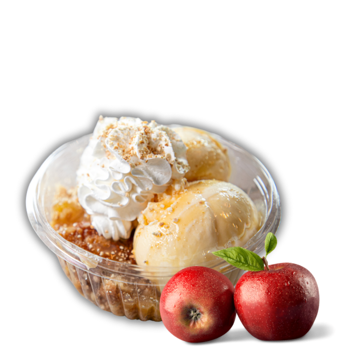 Made in-house apple cobbler served warm with a hefty scoop of vanilla ice cream, whipped topping, caramel drizzle and crushed graham crackers.