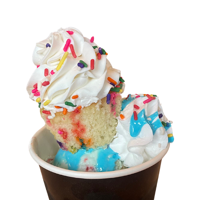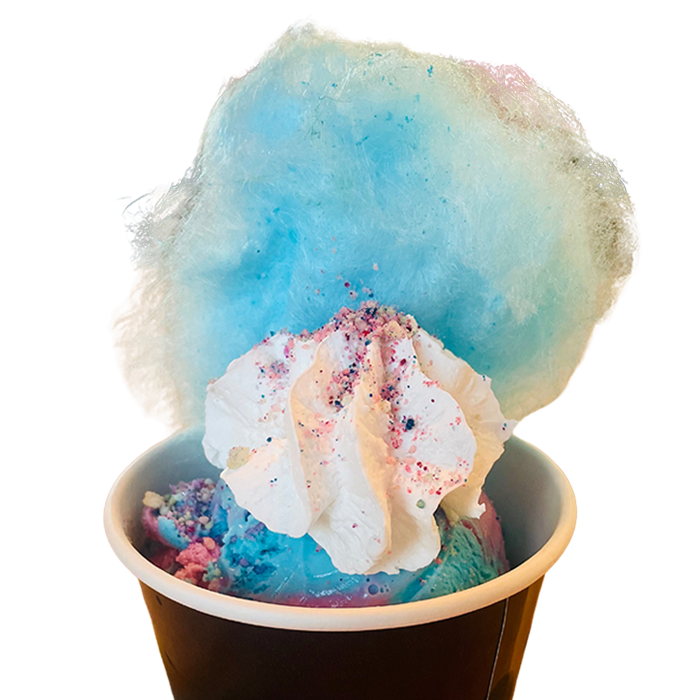 Single scoop of Cotton Candy ice cream topped with a cotton candy, whipped topping, and cotton candy crunch.