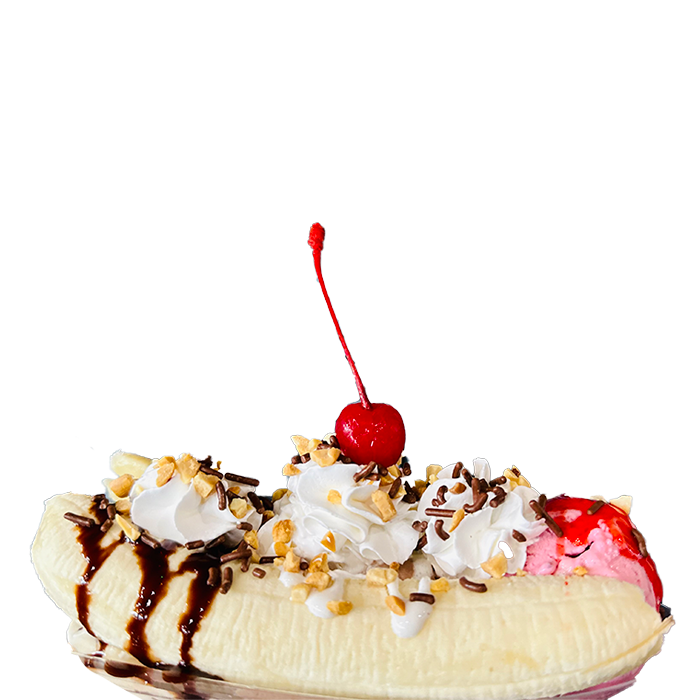 A whole banana sliced in half, served with a scoop of chocolate ice cream with drizzled chocolate sauce, vanilla ice cream with marshmellow sauce, strawberry ice cream with strawberry sauce and all of this topped with whipped cream, crushed peanuts, chocolate sprinkles and a cherry.