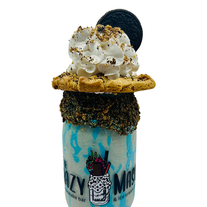Birthday cake ice cream in a blue marshmallow swirled jar with vanilla buttercream rim rolled in rainbow sprinkles. Topped with a cupcake and a lollipop, then finished with blue marshmallow drizzle, whipped icing and rainbow sprinkles.