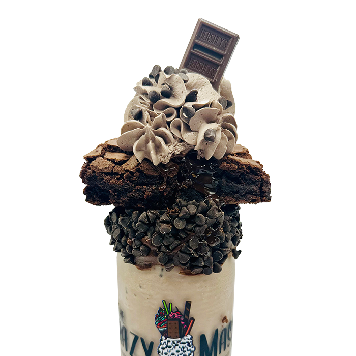 Chocolate Ice Cream in a chocolate-swirled jar with a chocolate fudge rim rolled in chocolate shavings. Topped with a hot fudge brownie and Hershey bar, chocolate whipped icing and finished with chocolate shavings.